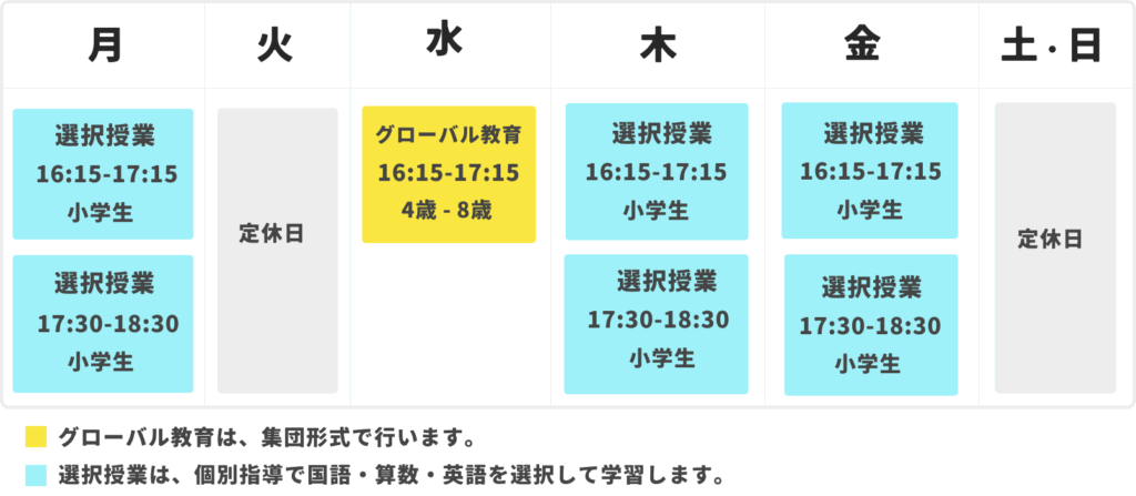 お好きな曜日・時間に、国語・算数・英語のどのクラスでも自由に選んで参加できる「選択式クラス」に!